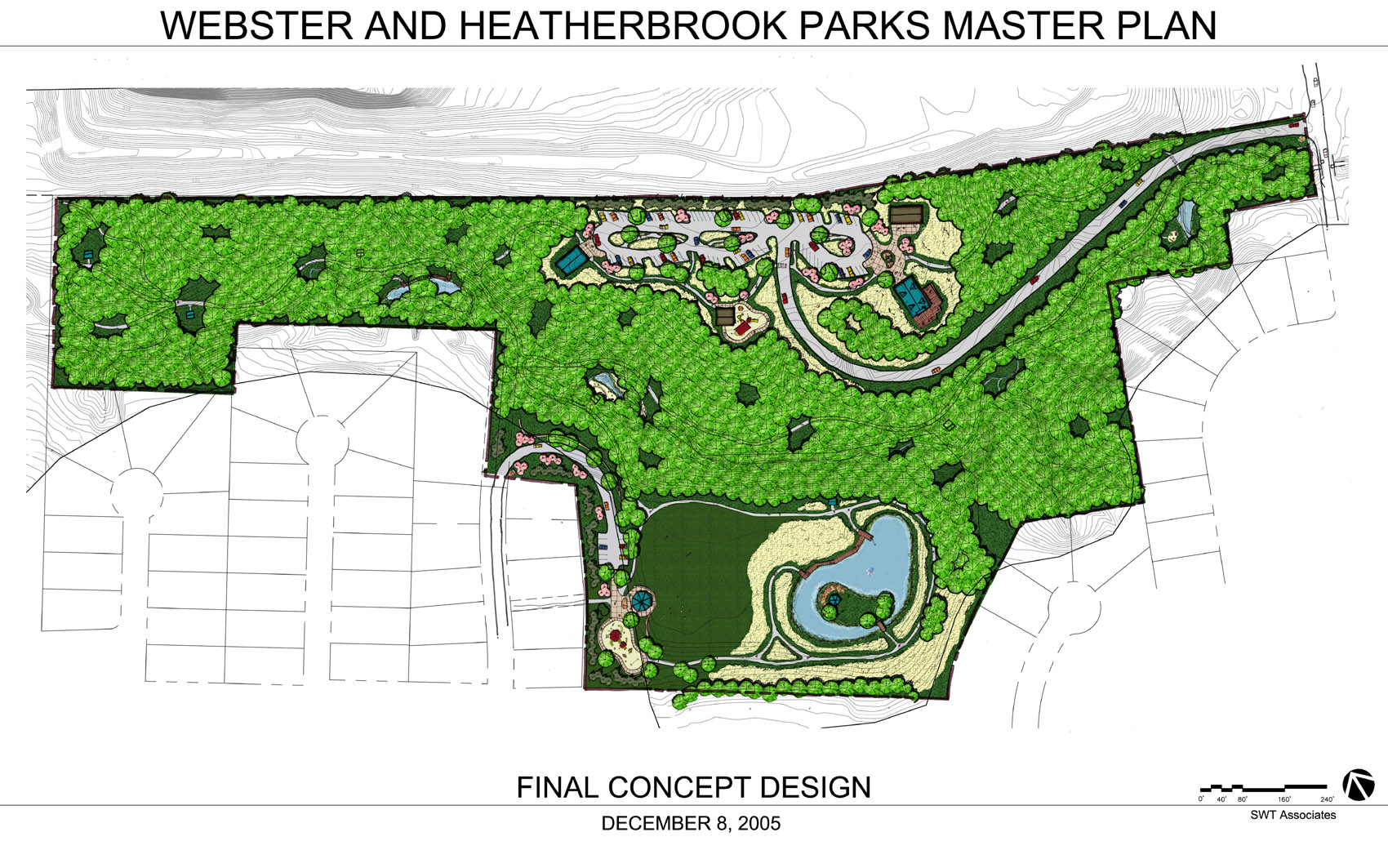Webster Park opened in 2013 and includes a playground, Community Building and shelter. It provides a mix of passive and active recreation and area connection by the parks internal loop trail system which also connects the park to Heatherbrook Park.